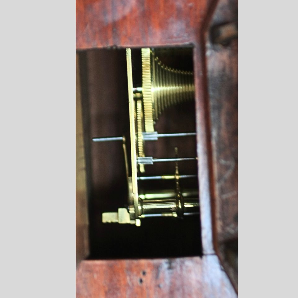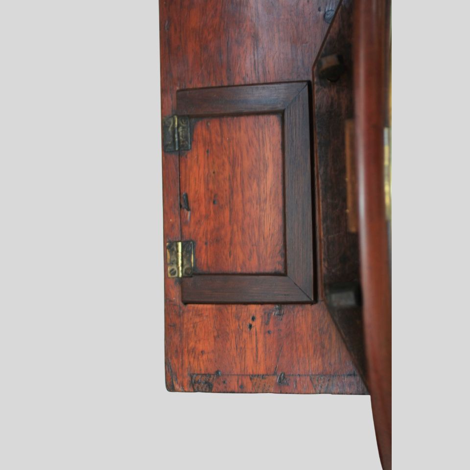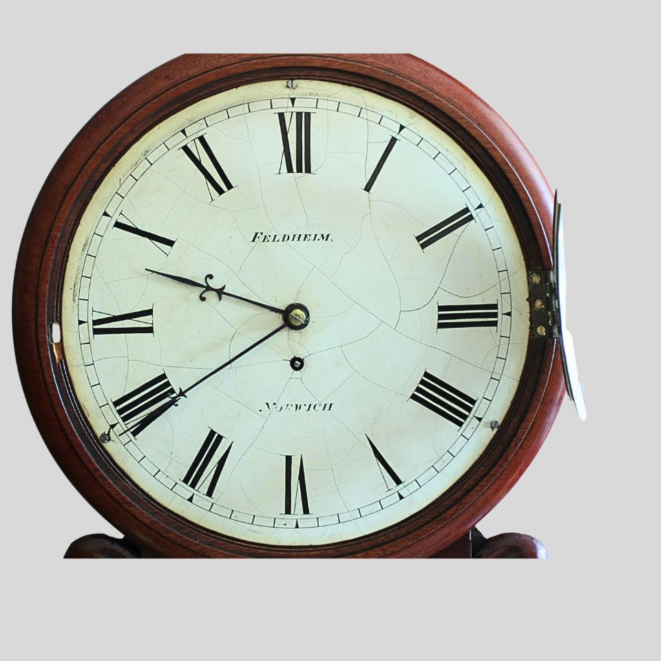 An antique 8 day drop dial timepiece, mahogany veneered case with brass inlays, painted dial signed Feldhelm, Norwich with 12″ dial. Circa 1830.