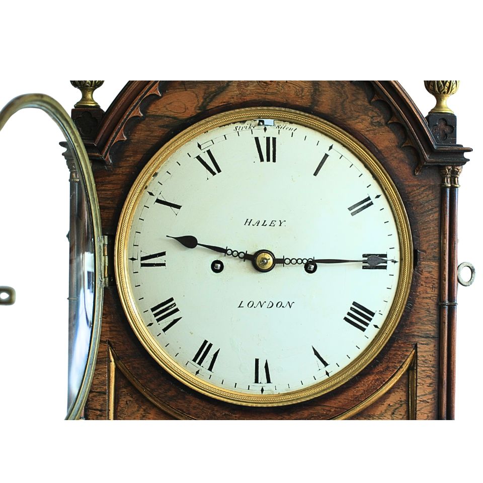 An antique twin fusee striking table clock, rosewood case with painted dial, signed Haley, London. 8 day duration, pierced steel hands with strike silence function, circa 1860. Size 54cms x 30cms x 19cms